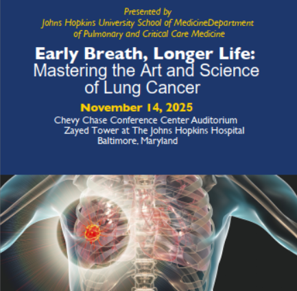 The Johns Hopkins Early Breath, Longer Life Mastering the Art and Science of Lung Cancer 2025 course provides an essential clinical update on lung cancer screening, early detection, and management. The program covers the latest ASCO updates for NSCLC and SCLC, advancements in precision medicine, multidisciplinary care, and practical strategies for addressing stigma and tobacco cessation. This one day, cutting edge educational symposium focuses on advances in lung cancer screening and nodule management that will aim to improve community engagement, patient care, and communication as multidisciplinary groups.